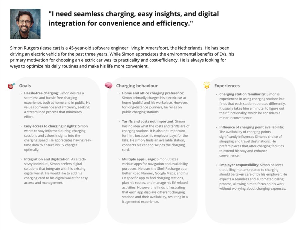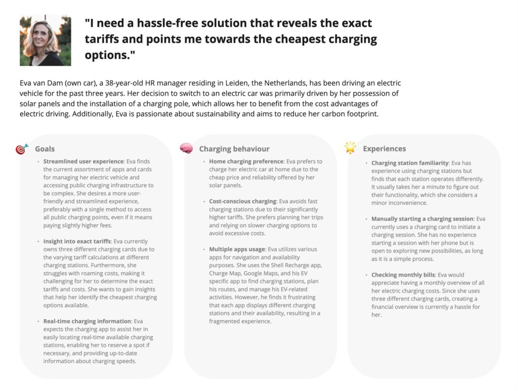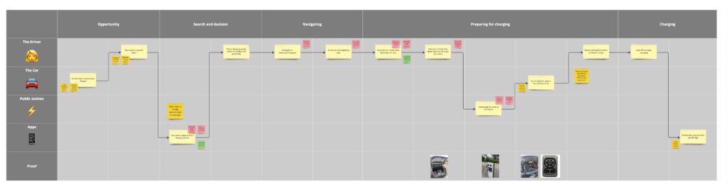 The user journey map was developed to illustrate both pain points and positive experiences within the overall user experience of EV charging. We learned that there are many different charging stations and cars, so the charging process is not linear.